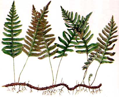 Das mittlere Bild zeigt den Tüpfelfarn. Der wächst auf moosigem Waldboden, bemoosten Mauern, bemoosten Felsen und auf bemoosten alten Bäumen. Er wird 10-50 cm hoch und riecht angenehm. |